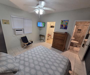 Room #5 aka: The Mermaid Cove is a 1 bedroom located in the back of The Coral House, on the 1st floor, east side facing the beach. It has a queen sized pillow top bed so it’s perfect for 1 guest or a couple, table with 2 chairs, a closet for your clothes + dresser, a separate full kitchen and a stainless steel sink, microwave, stove, oven, pots, pans, dishes, bathroom with a remodeled bathroom/shower, 32' Smart TV and Wi-Fi. Everything needed for an Affordable Hollywood Beach Florida Vacation!
