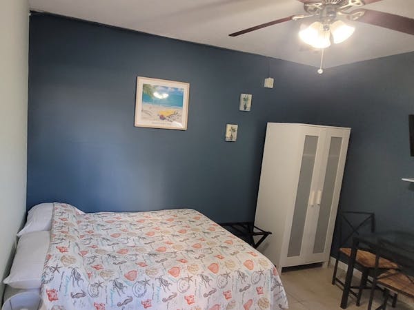 Turtle Nest also room #2. It's a 1 bedroom or Deluxe Efficiency, located in the middle of The Coral House on the 1st floor. You enter through the gated patio area, which is right outside the apartment & perfect to enjoy an ocean breeze or read a book. It has a queen sized bed & dresser, 32’ smart TV & Wi-Fi,. The kitchen is a separate room & includes a table with 2 chairs, pantry shelves, kitchen cabinets & kitchen sink, cutting board & a microwave, stove, oven, pots/pans, dishes, a shower/bathtub. Everything needed for a vacation. Perfect for 1 guest or a couple. A 3rd guest can be accommodated if a rollaway bed is set up in the kitchen area.