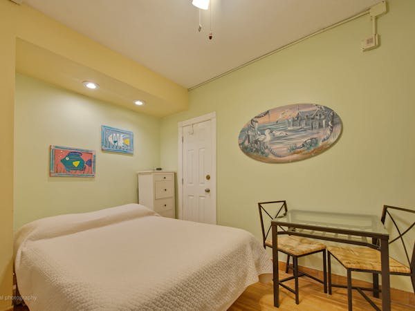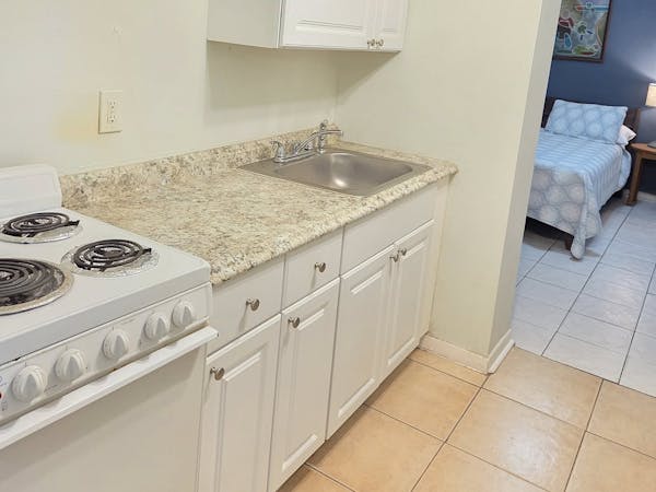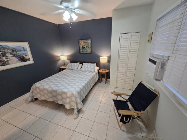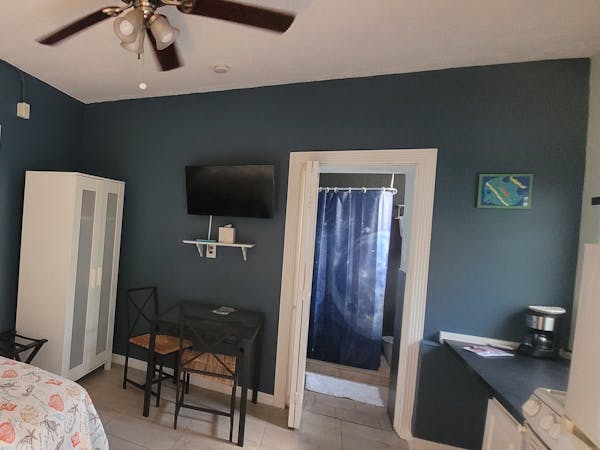 Room #4 aka: The Seahorse Hideaway is an updated 1 bedroom apartment where the wall was removed separating the kitchen to the bedroom to create an O-P-E-N Floor plan. It’s located on 1st floor, SE Corner of The Coral House. You enter through the gated patio area, which is outside the apartment & perfect to enjoy an ocean breeze or read a book. There is also a small patio table located right outside the apartment. There is a pillow top queen sized bed, armoire/closet, futon couch and a 32' Smart TV with lots of apps & Wi-Fi. The kitchen is separated by a large quartz countertop and stainless steel sinks. There is also a table with 2 chairs, kitchen cabinets, microwave, stove, oven, pots, pans, dishes, and a Huge Bathroom. Everything needed for a vacation. Perfect for 1 guest or a couple. A 3rd guest can be accommodated if the sofa/futon couch/bed will work.