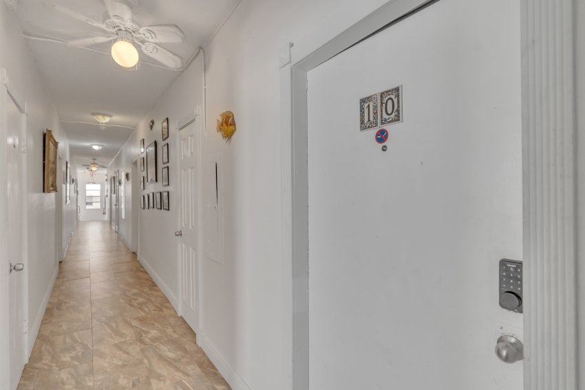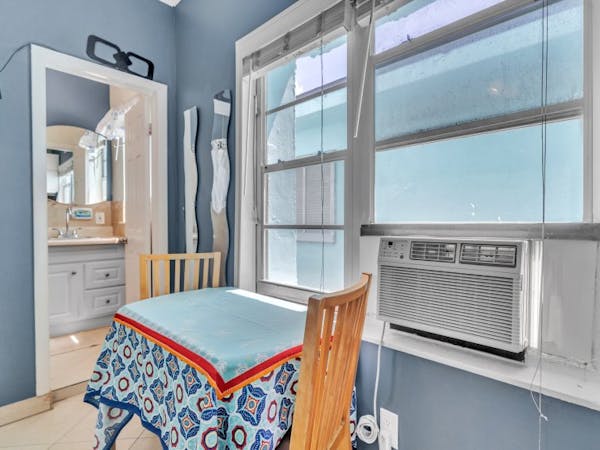 Rays Retreat also Room #10 is an updated efficiency located on SE Corner of the 2nd floor of The Coral House. You enter through the gated foyer area & go up 1 flight of stairs. The balcony is located right outside the apartment & is perfect for enjoying a cup of coffee. It has a full sized pillow-top bed which makes this apartment perfect for 1 guest or a couple. It includes a dresser, kitchen table with 2 chairs, closet, a kitchen cabinets, microwave, stove, oven, pots, pans, dishes, 32' smart TV, Wi-Fi, bathroom with a shower & a pub style sink in the bathroom. Everything needed for an affordable vacation right on Hollywood Beach!