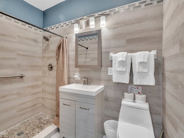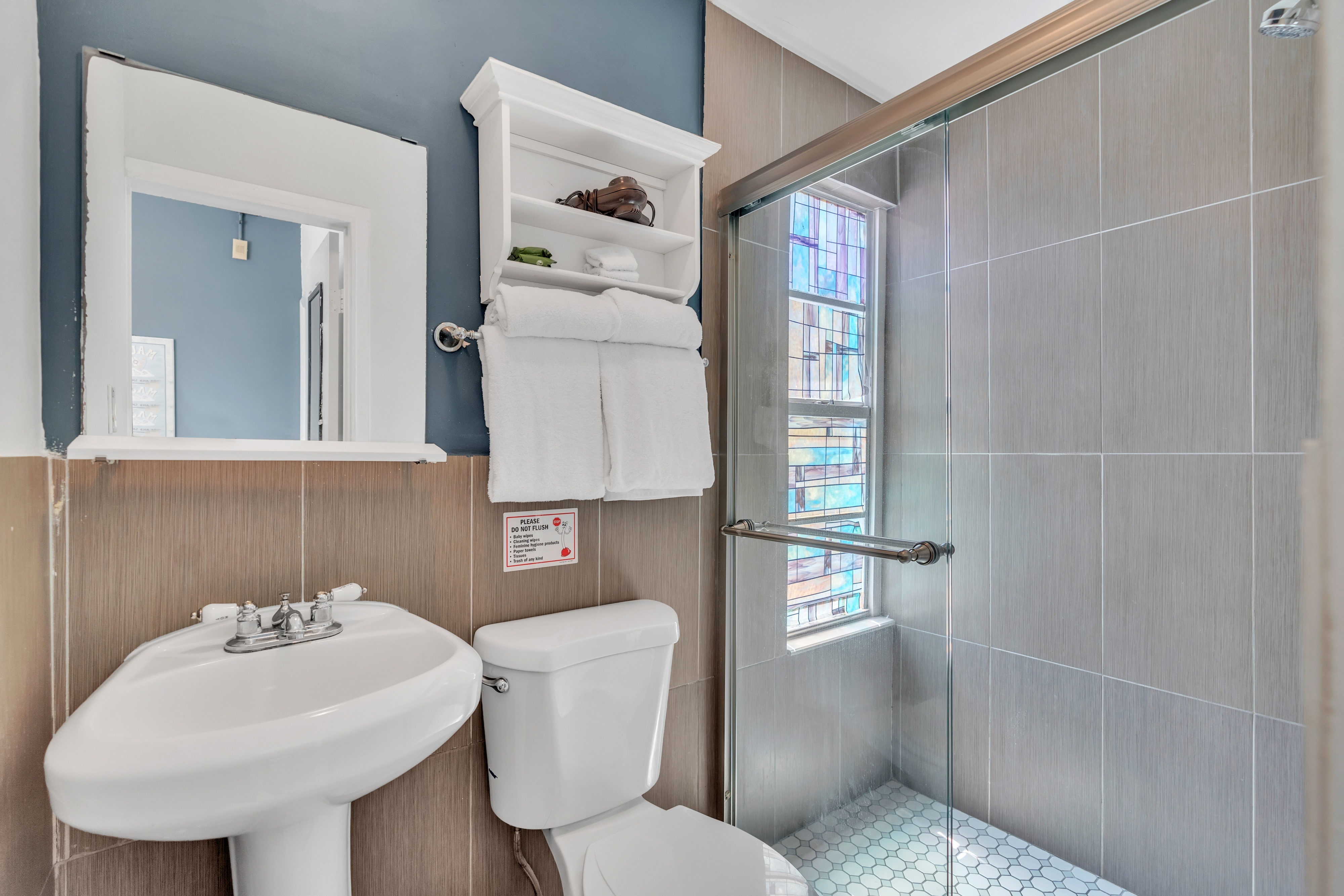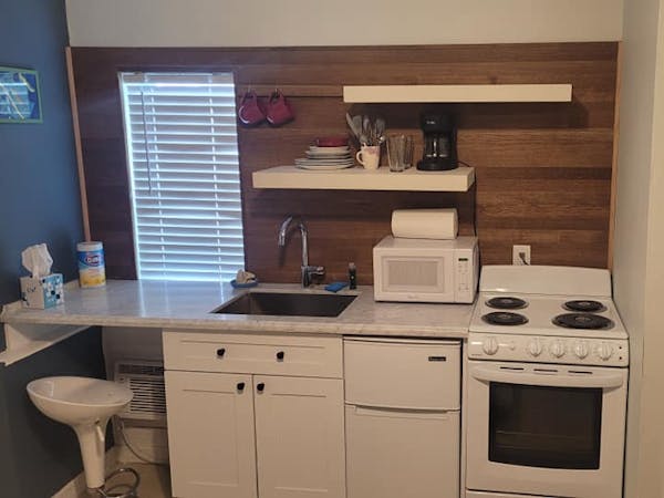 Room #3 aka:”The Starfish Suite” is a remodeled deluxe efficiency that is located in the rear and on the 1st floor. You enter through the gated patio area. This apartment features a Queen sized bed, dresser, kitchen table with 2 chairs, a large clothing closet, kitchen cabinets, 32' smart screen TV, Wi-Fi, stove/oven, microwave, pots, pans, dishes and utensils. The bathroom has a remodeled large shower. The apartment is perfect for 1-2 guest with room for a rollaway bed and 3rd guest, if needed. It has everything needed for a relaxing and fun vacation