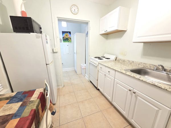 Room #6 aka: White Pearl is an efficiency that was remodeled in 2025. It’s located in the middle of The Coral House, on the 1st floor, east side facing the beach. It has a full sized pillow top bed so it’s perfect for 1 guest or a couple, table with 2 chairs, an armoire for your clothes, a kitchenette and a stainless steel double sink, microwave, stove, oven, pots, pans, dishes, bathroom with a shower, 32' Smart TV and Wi-Fi. Everything needed for an Affordable Hollywood Beach Florida Vacation!