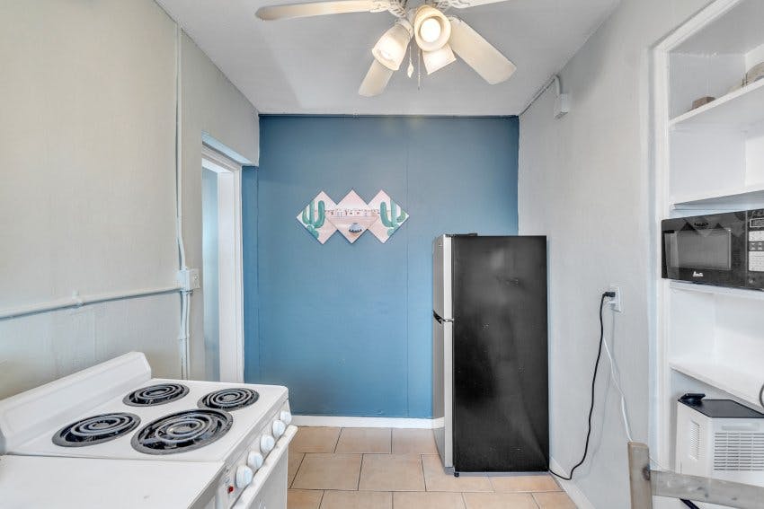 Turtle Nest also room #2. It's a 1 bedroom or Deluxe Efficiency, located in the middle of The Coral House on the 1st floor. You enter through the gated patio area, which is right outside the apartment & perfect to enjoy an ocean breeze or read a book. It has a queen sized bed & dresser, 32’ smart TV & Wi-Fi,. The kitchen is a separate room & includes a table with 2 chairs, pantry shelves, kitchen cabinets & kitchen sink, cutting board & a microwave, stove, oven, pots/pans, dishes, a shower/bathtub. Everything needed for a vacation. Perfect for 1 guest or a couple. A 3rd guest can be accommodated if a rollaway bed is set up in the kitchen area.