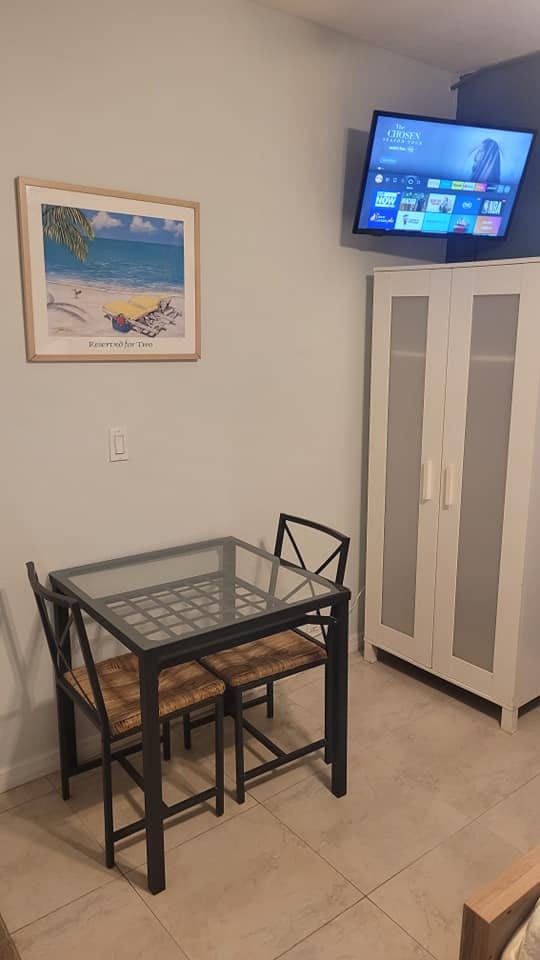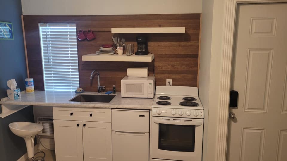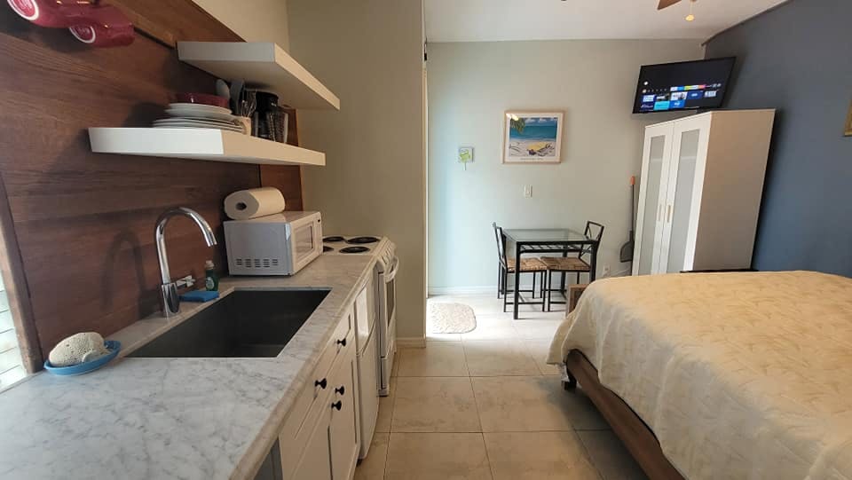 Room #3 aka:”The Starfish Suite” is a remodeled deluxe efficiency that is located in the rear and on the 1st floor. You enter through the gated patio area. This apartment features a Queen sized bed, dresser, kitchen table with 2 chairs, a large clothing closet, kitchen cabinets, 32' smart screen TV, Wi-Fi, stove/oven, microwave, pots, pans, dishes and utensils. The bathroom has a remodeled large shower. The apartment is perfect for 1-2 guest with room for a rollaway bed and 3rd guest, if needed. It has everything needed for a relaxing and fun vacation