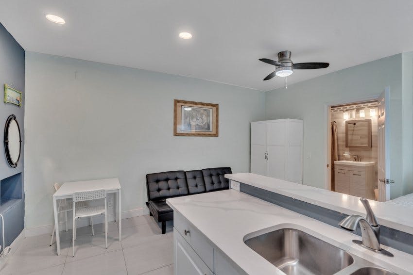 Room #4 aka: The Seahorse Hideaway is an updated 1 bedroom apartment where the wall was removed separating the kitchen to the bedroom to create an O-P-E-N Floor plan. It’s located on 1st floor, SE Corner of The Coral House. You enter through the gated patio area, which is outside the apartment & perfect to enjoy an ocean breeze or read a book. There is also a small patio table located right outside the apartment. There is a pillow top queen sized bed, armoire/closet, futon couch and a 32' Smart TV with lots of apps & Wi-Fi. The kitchen is separated by a large quartz countertop and stainless steel sinks. There is also a table with 2 chairs, kitchen cabinets, microwave, stove, oven, pots, pans, dishes, and a Huge Bathroom. Everything needed for a vacation. Perfect for 1 guest or a couple. A 3rd guest can be accommodated if the sofa/futon couch/bed will work.