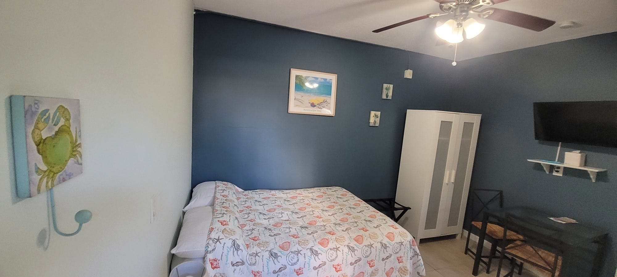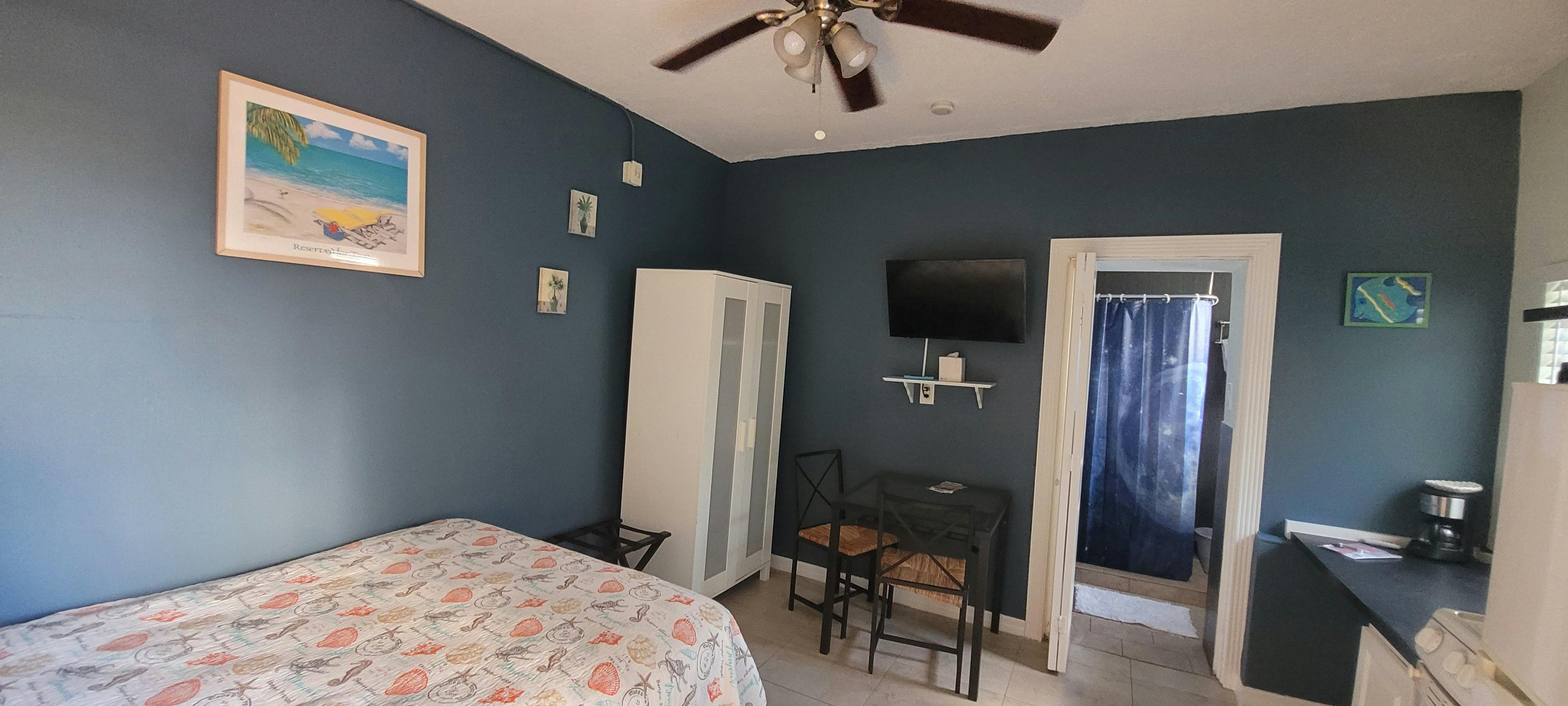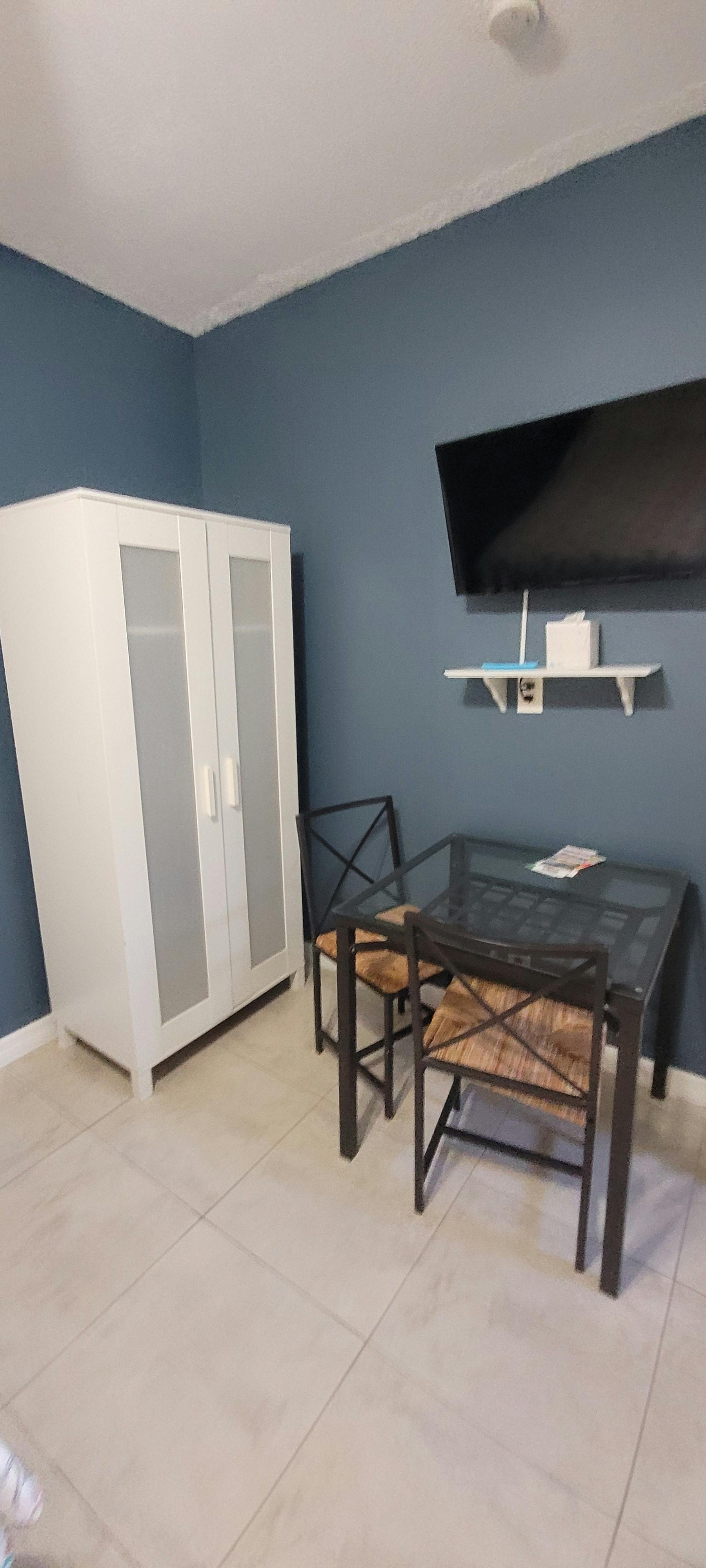 Room #6 aka: White Pearl is an efficiency that was remodeled in 2025. It’s located in the middle of The Coral House, on the 1st floor, east side facing the beach. It has a full sized pillow top bed so it’s perfect for 1 guest or a couple, table with 2 chairs, an armoire for your clothes, a kitchenette and a stainless steel double sink, microwave, stove, oven, pots, pans, dishes, bathroom with a shower, 32' Smart TV and Wi-Fi. Everything needed for an Affordable Hollywood Beach Florida Vacation!