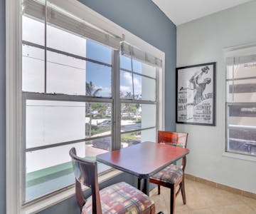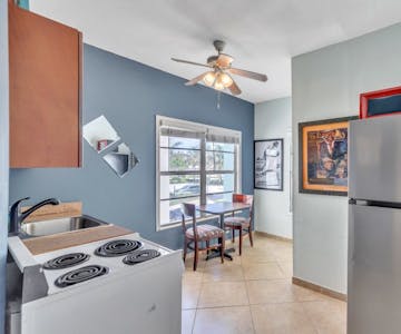 Room #7 aka: The Tidal View is an updated 1 bedroom apartment located on 2nd floor / NE Corner of The Coral House. It has a Full Kitchen with a kitchen/living area. Pots, Pans, dishes and everything needed to prepare your meals. The bedroom consists of a queen size bed, dresser, open closet, 32’ smart TV, Wi-Fi and a large bathroom. This room can accommodate 2 to 3 guests, comfortably if the 3rd guest is comfortable on a rollaway bed. Everything needed for a comfortable and convenient vacation or stay on Hollywood Beach is here!